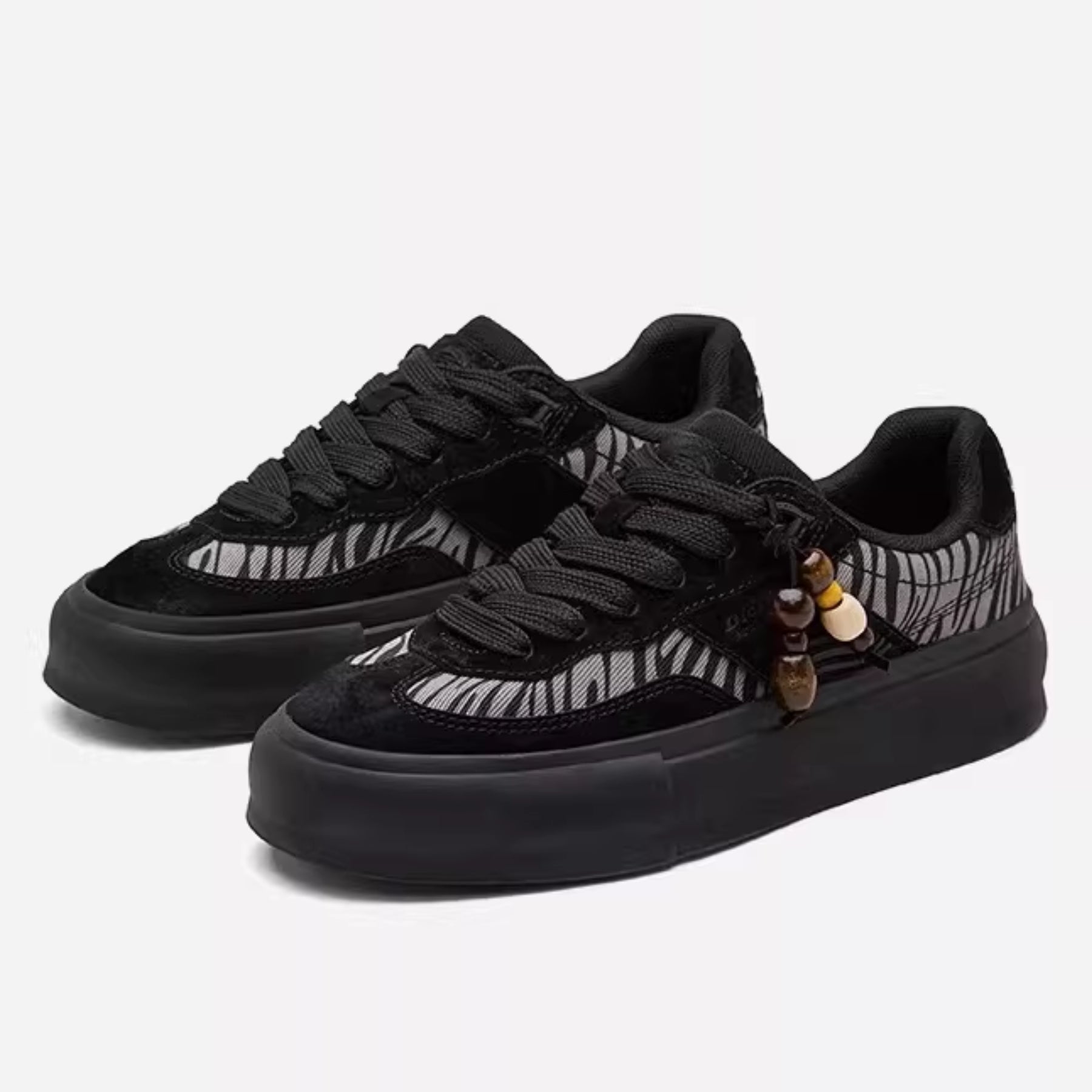 Retro skateboard Trainer silhouette with a thick platform sole with contrasting white laces, vintage-style stitching, and decorative beaded charms attached to the lacing system.