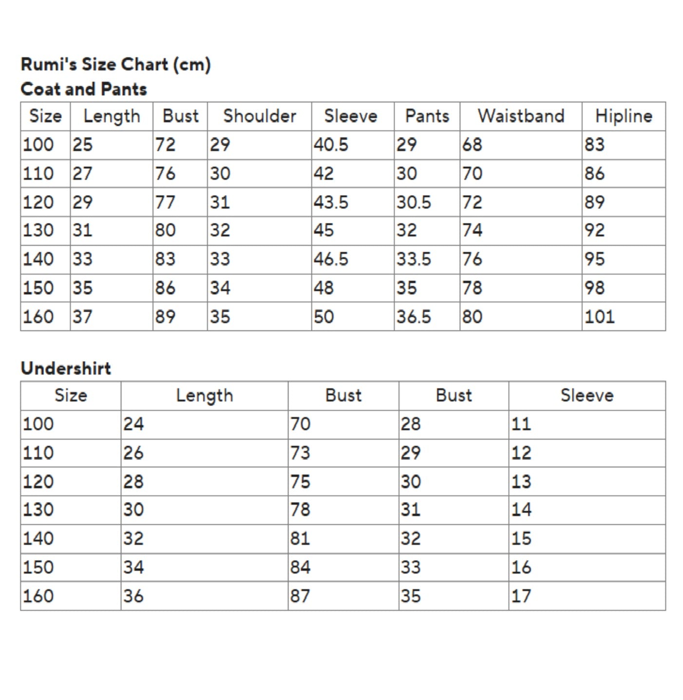 Please refer to the size chart for specific measurements. Common sizes include 100cm, 110cm, 120cm, 130cm, 140cm, 150cm, and 160cm.