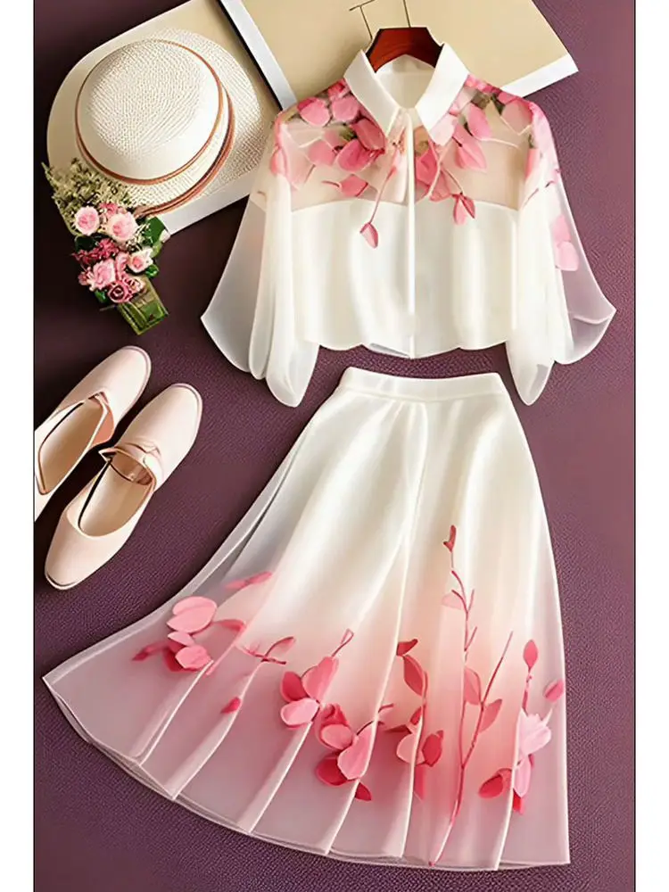 Temperament Blouse Skirts 2pcs Set Lady Chiffon Clothes